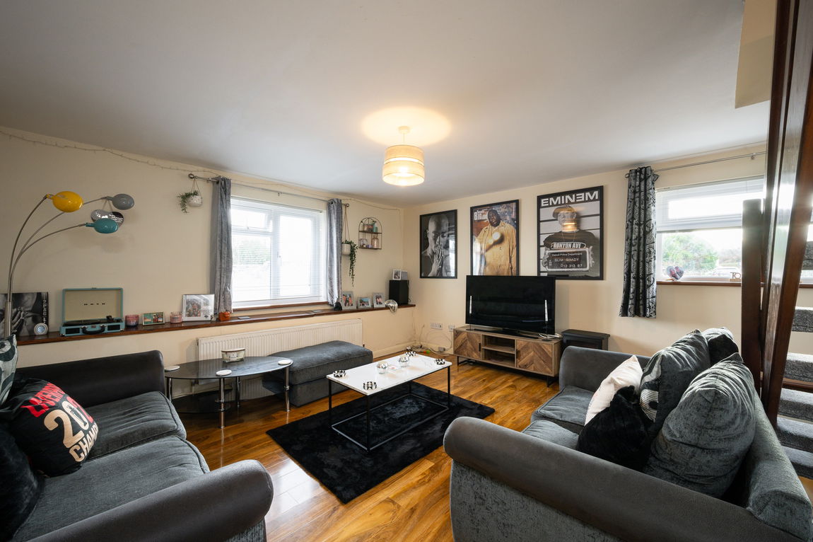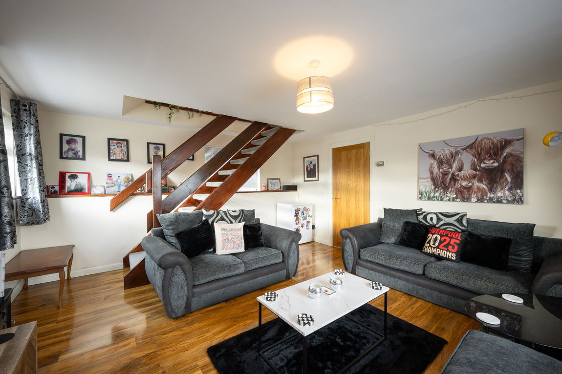 The ground floor features a modern, well-appointed kitchen/diner fitted with stylish gloss units and integrated appliances, creating a practical yet attractive space for everyday living. To the front of the property is a cosy lounge, offering a comfortable retreat with stairs rising to the first floor.